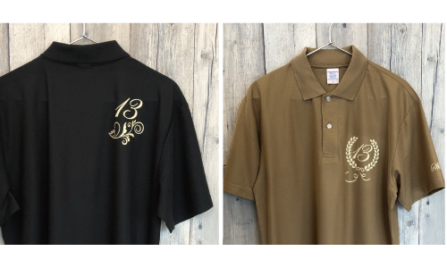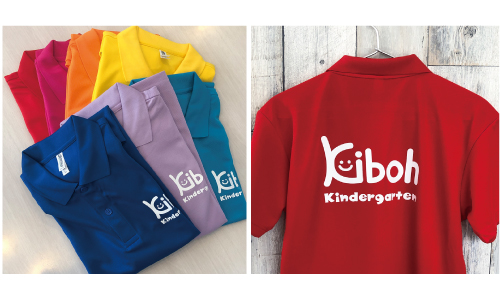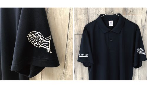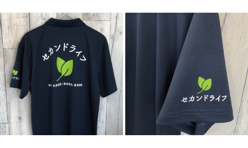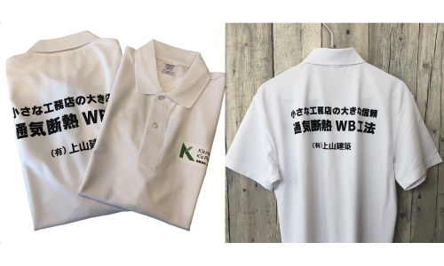 白のポロシャツにくっきりとしたプリントで、見る人に安心感を与えつつ、会社の特徴や想いが伝わります。 -