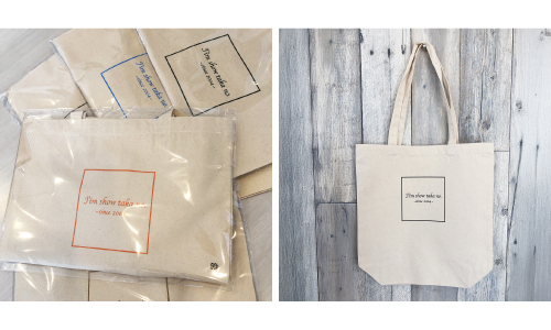 事務所周年記念品にトートバッグを制作!デザインはシンプルに、プリント色はバリエーションをつけて色違いでカラフルな仕上がりです。 -