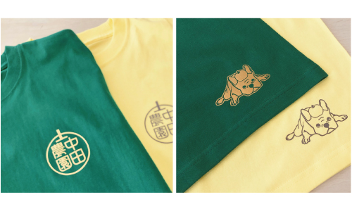 胸にちょこんと入った梨の形のロゴが印象的で、 裾のわんこがほっこり可愛いポイント。農園の雰囲気にぴったりな、やさしい仕上がりになりました。 -