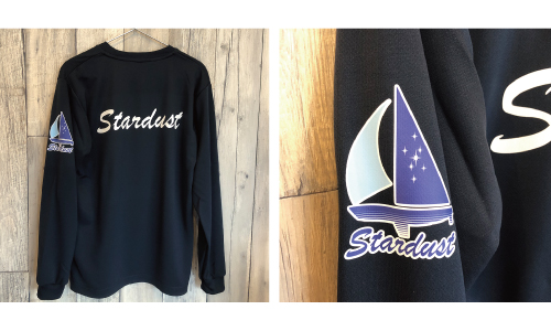 袖にはヨットクラブのロゴマーク、背中には大きくチーム名をプリントしたデザイン。活動中でも遠くから目を引く仕上がりです。 -