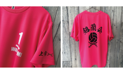 バレーボールのチームTシャツです。チーム名にちなんだデザインや鮮やかな蛍光ピンクの色合いが目を引きます! -